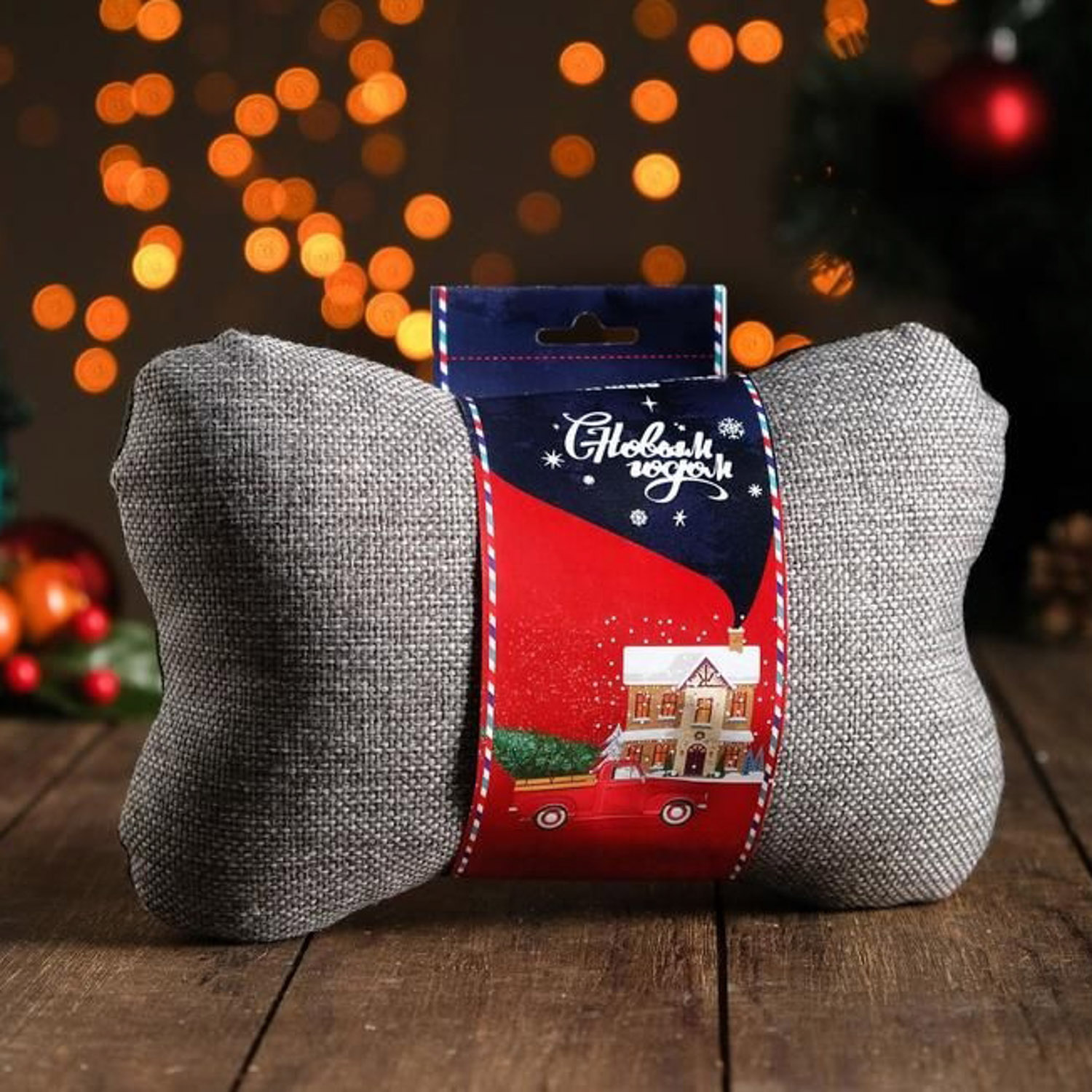 Подушка автомобильная подарочная "Новый год", на подголовник, лен, серый, 18х26 см 5458982