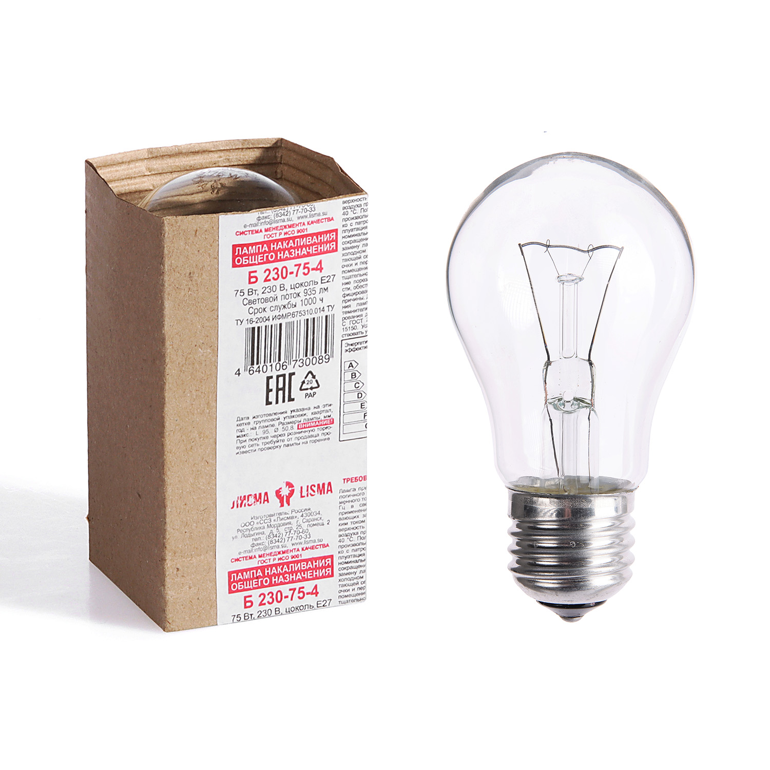 Лампа накаливания Лисма, Е27, груша, 75 Вт, 935 Лм, теплый белый свет