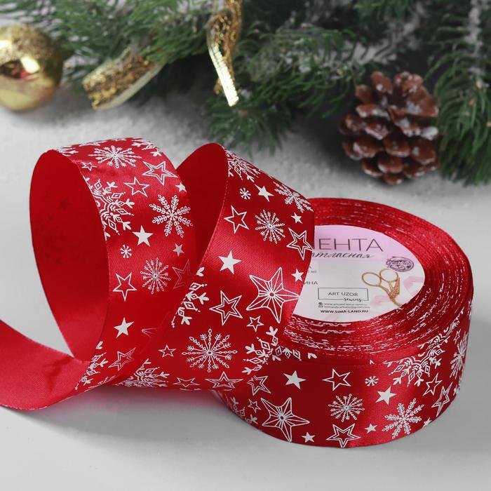 Лента атласная 40мм*25±1ярд снежинки №33 красный/белый АУ 4937929