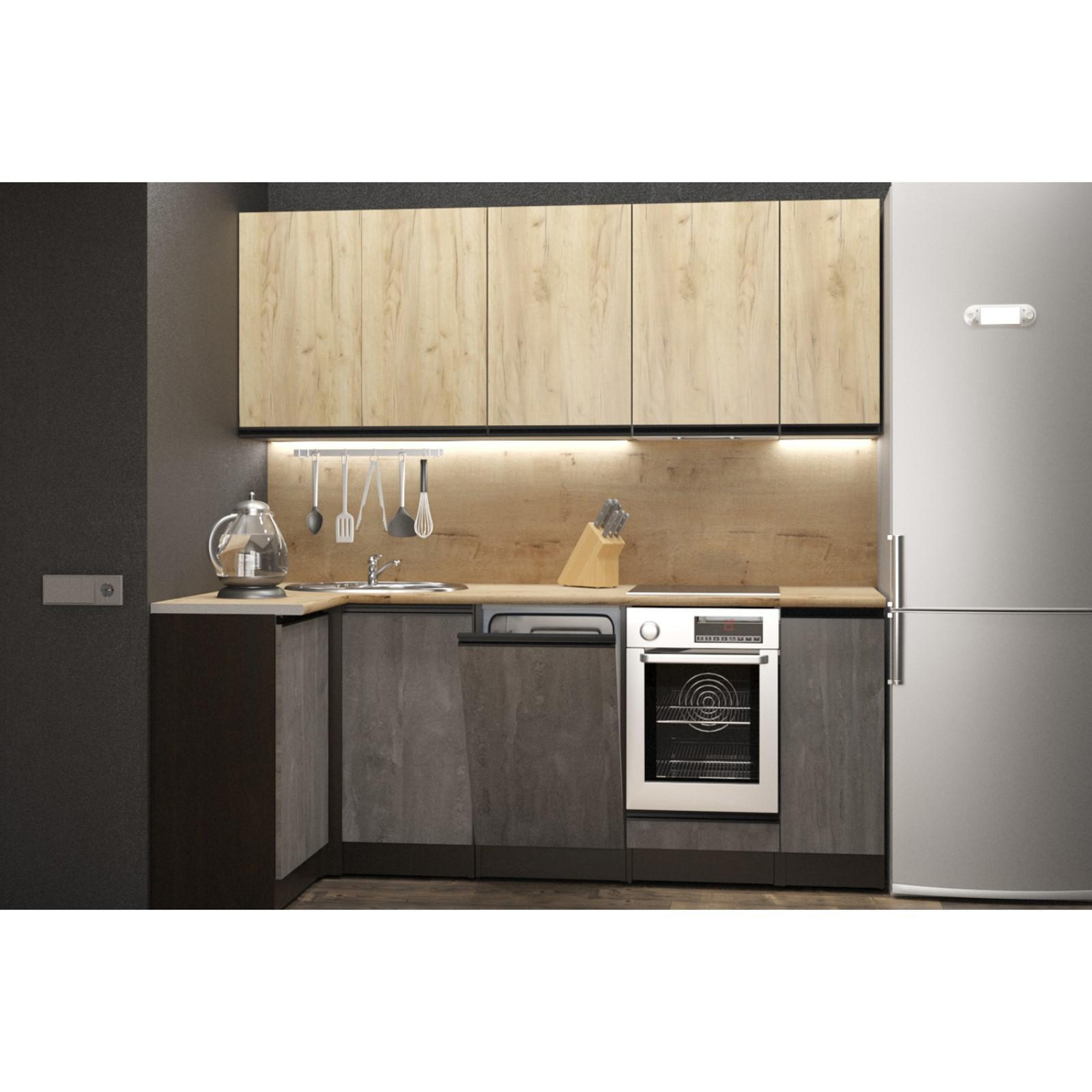 Кухонный гарнитур из ЛДСП в модном цвете впишется в современный дизайн интерьера. Подойдет как для частного дома, так и для небольшой квартиры. Напольные и подвесные шкафы позволят разместить всю кухонную утварь. Гарнитур состоит из набора шкафов, которые органично комбинируются между собой. Ящики, полки, навесные шкафы, тумбы и пеналы можно менять местами, создавая практичное рабочее пространство.