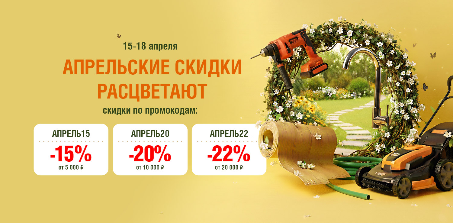 Скидка распространяется только на товары с белыми ценниками и с шильдиком «АПРЕЛЬ», не распространяется на товары с желтыми ценниками, на гр. Строительные материалы. Не суммируется с другими акциями (в том числе со скидкой по дисконтной карте, скидкой для пенсионеров и акцией для новоселов). При применении промокода списание бонусов станет недоступным. Подробности акции можно узнать у продавцов-консультантов, операторов интернет-магазина или по телефону горячей линии. Оплатить покупку акционных товаров бонусами в дни акции нельзя, но бонусы за покупки будут начисляться. Акция действует только для физических лиц.